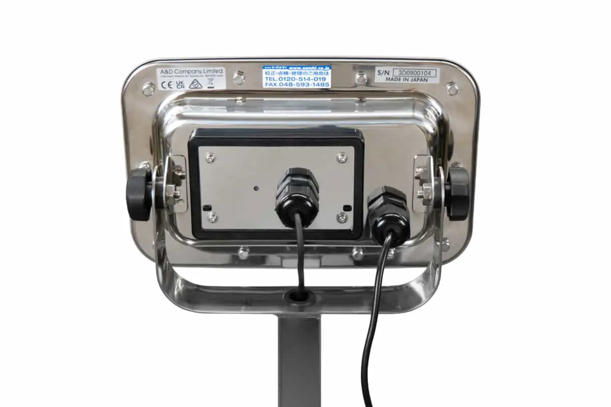 全不銹鋼結構: 所有秤的組件(顯示單元、秤盤、支柱和框架)均採用SUS304不銹鋼製造,確保耐用性和衛生性。負載單元則使用SUS420J-2材料,並附有保護塗層。